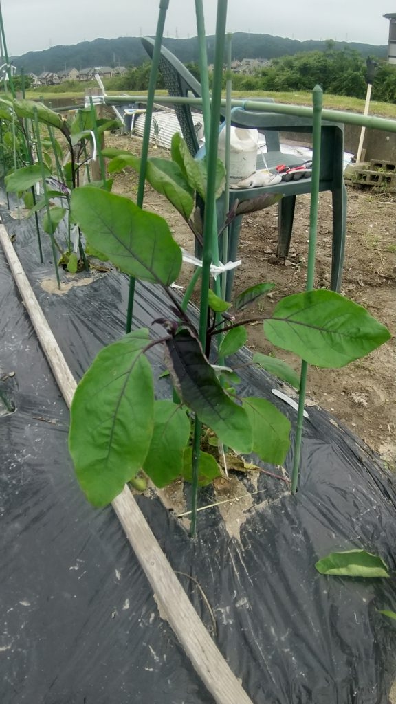 ナスが大きくなったので、しっかり根を張ってきたと思う。なのでかぶせていた、風よけの袋をとった。