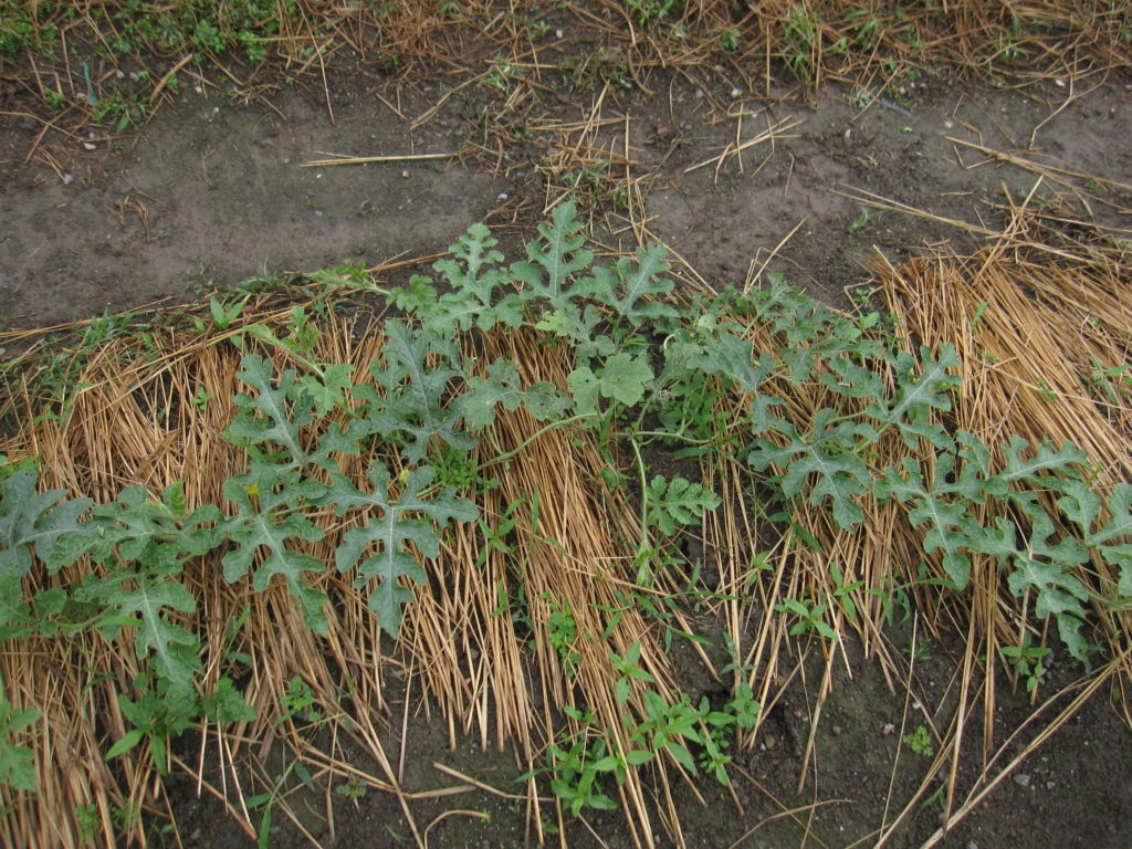 スイカ 3本あるが順調につるが伸びてきた。6節目以降のえだの先をつんだから、今伸びているのは子つるだ。