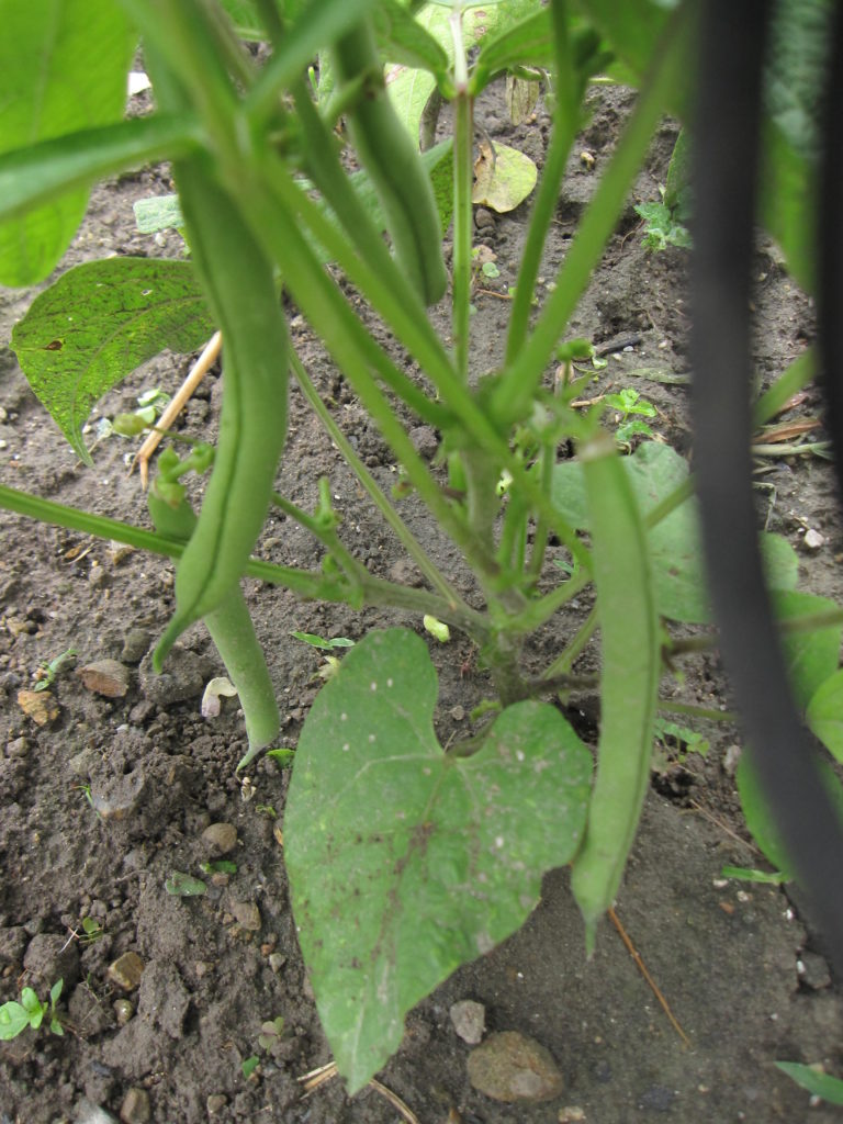 インゲン豆はあまり大きくならなかった、急にいただいた苗なので、肥料をすきこめてなかった為と思う。でもかわいい豆ができてきた。