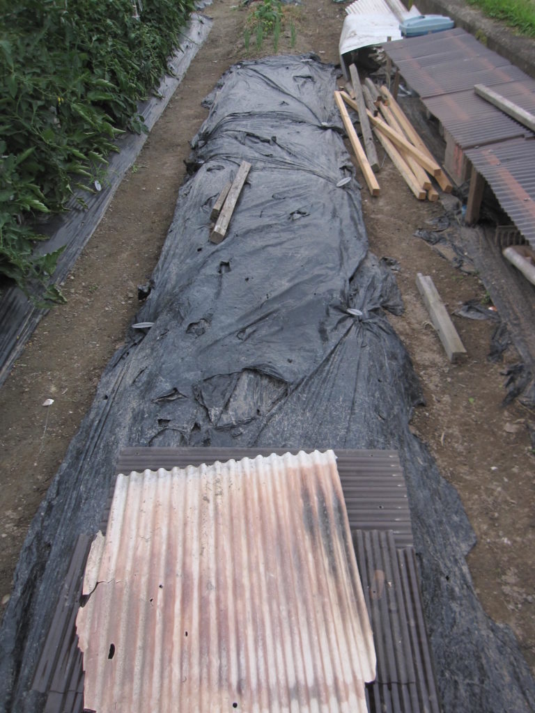 先日石灰とたい肥を入れて耕した畝に米ぬかをまいて軽く耕し水をまいて、古い黒マルチをかけた。