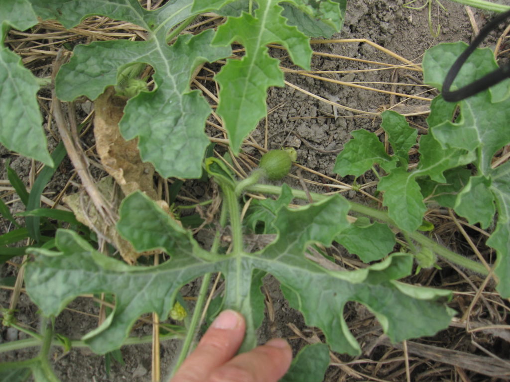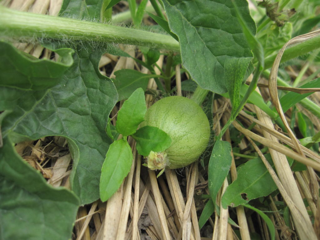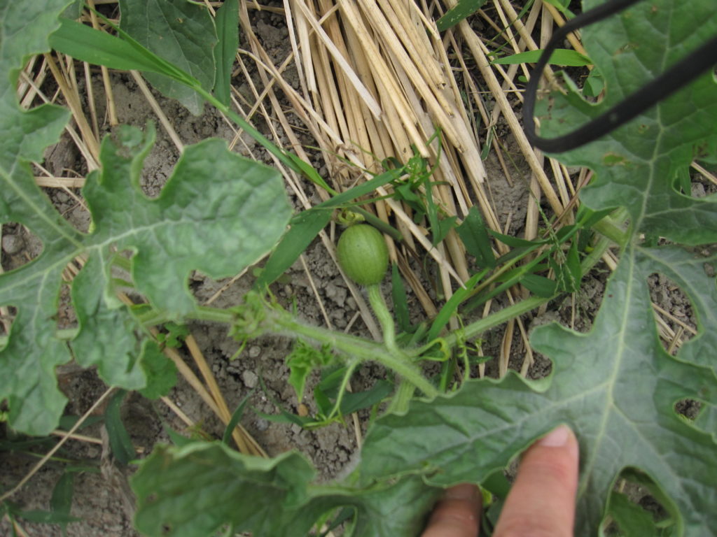 スイカのつるがこんなに広がって来た。歩くところにはみ出すと踏んでしまいそうなので、全部畝に戻しているので、込み合っている。中にかわいいスイカの実ができていた。