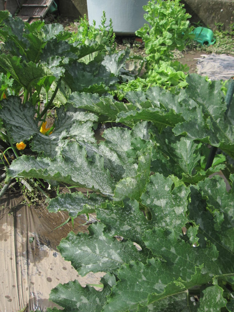 今日はカメラをもっていかなかった。ズッキーニを収穫しようと思ったら、葉の下の方が白い粉をまぶしたようになっていた。全体の1/4くらいだろうか。調べるとどんな種類にも発生して、、暖かく夜間の湿度の高い環境で繁殖して、晴れてやや乾燥した日に胞子が風に乗って飛ばされ被害が広がる。一般的に窒素肥料が多くカリ成分が足りないと発生しやすい。窒素過多だったのかもしれない