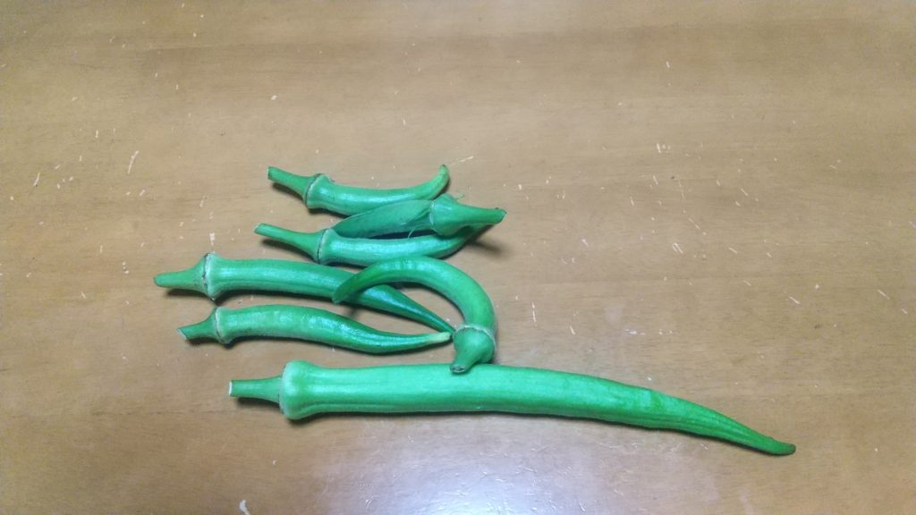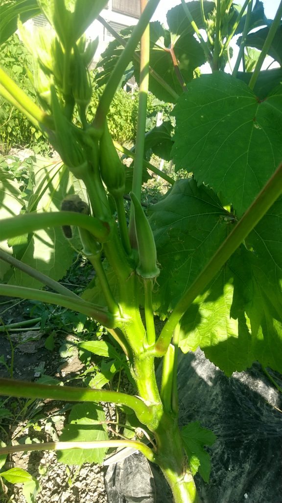 オクラができてきた。忘れていた、今年は丸いオクラの種をうえたのだった。いつもは5角形のオクラで、いつも取り忘れると大きくなり過ぎて、食べてもがりがりするくらい堅くなる。