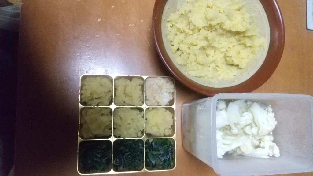 やっと休みでなので、サツマイモとカンズメのパイナッブルのきんとんとカリフラワーの酢つけと千枚漬けを作った。9個入る入れ物は、今年買ったおせちの仕切りとして入っていたもので、これに入れラップをして冷凍庫にいれ、お弁当箱にそのまま入れる。
