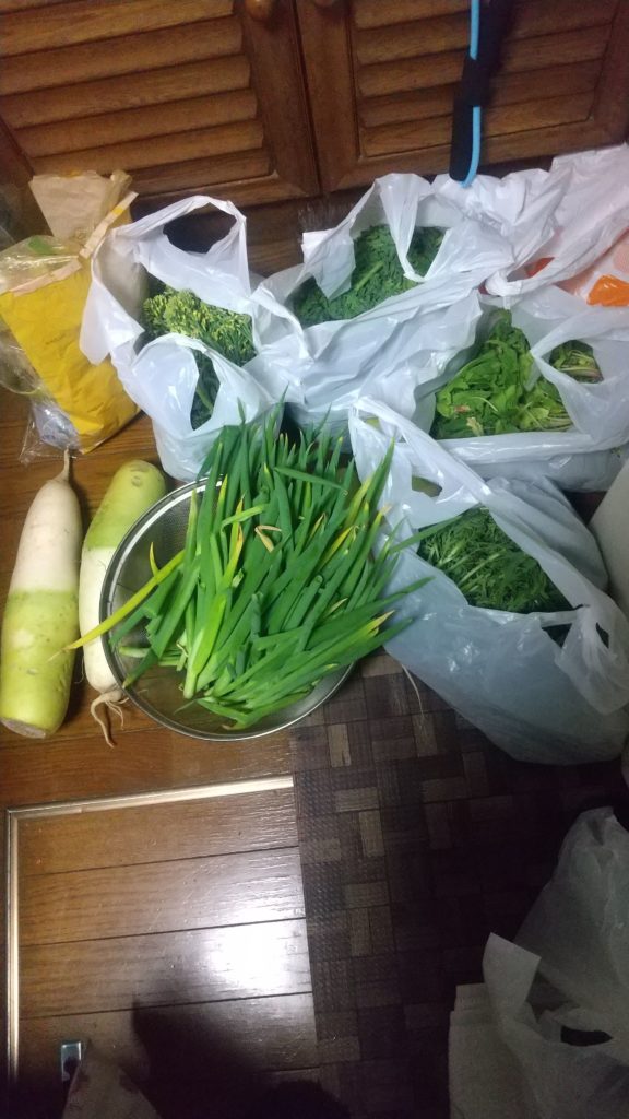 畑は夏野菜の準備で、冬の野菜の残りは片づける。今日はネギを切ってきたのと、春菊の先の方だけ採ってきた。ほうれん草の残りも持って帰った。ブロッコリーも花がつぼみになっているが茎が軟らかいなら、食べられるかもと思って、収穫してきた。