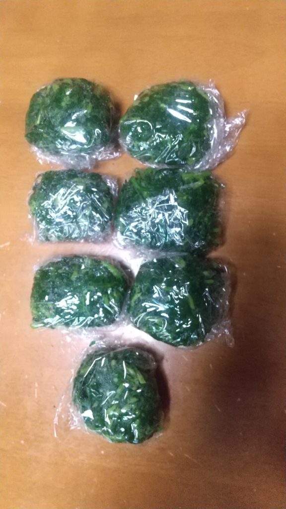 結局、何とかなったのは春菊だけだった。ほうれん草は小さすぎて食べるところはなく、ブロッコリーの茎はゆでても堅くて、筋ばかりでダメだった。春菊は先の方だけちぎって、ざるいっぱいにはなった。ゆでて小分けにして、お弁当用に冷凍した。お弁当の幅に凍ったまま入れると一品になる。