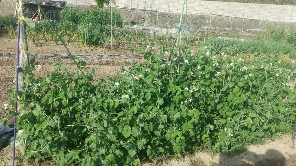 エンドウの花がいっぱい、かわいい!! もうすぐ収穫できそうだ、スナックエンドは少ないかもしれないが、うすいエンドウは例年通り豊作のような気がする。大好きなので、楽しみーー。