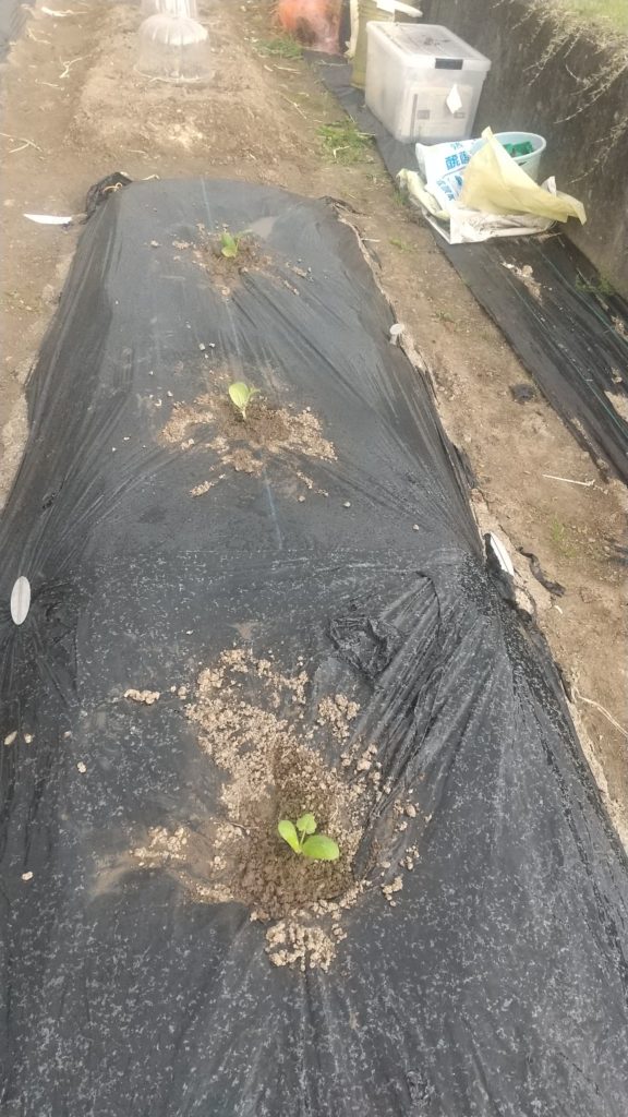 真ん中はズッキーニ、苗は小さいが大丈夫ですとお店の人が言われた。この苗が1mくらいに成長するので2m くらいは間をあけて植えた。