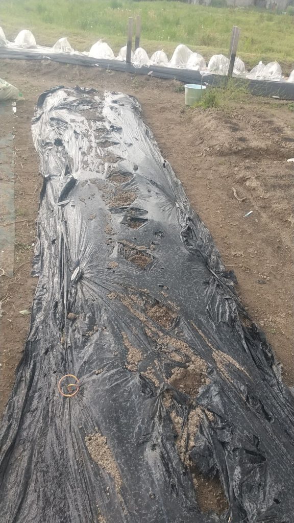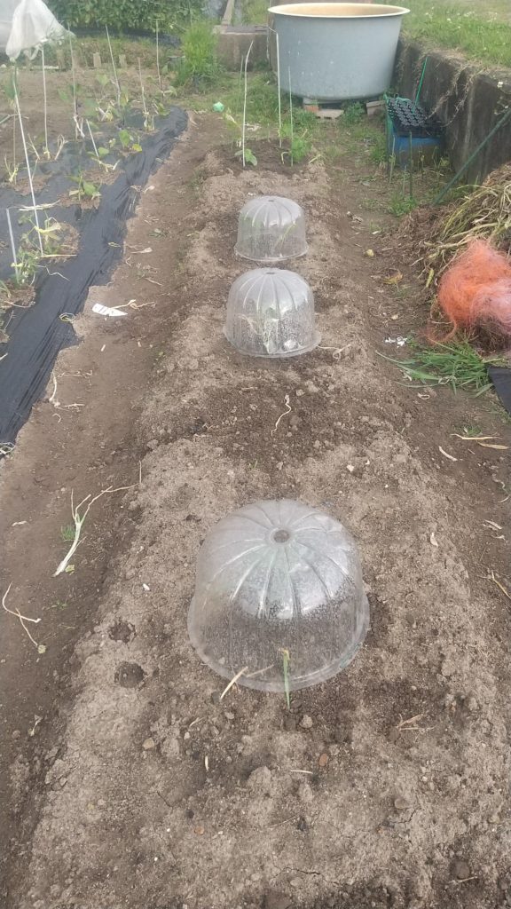 スイカは小玉スイカばかりで3本昨年は夫が種を植えていたのが良くなったが今年は苗をかった。真ん中50センチ離して米ぬかをいっぱいいれた。まだ寒いのでキャップをしないと寒さに弱い。