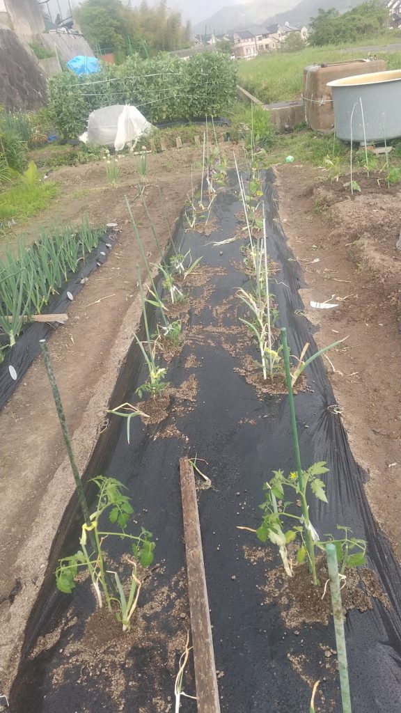 その横は桃太郎トマト10本ちょっと多いように思うが、何本かはいつもダメになるから、プチトマトのあいこ8本、なす科は残りはピーマンはもう少し後で植えようと思ってまだ苗は買っていない。