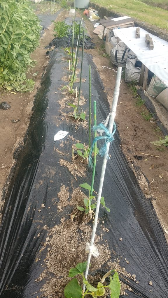 きゅうりとゴーヤ、思ったより予定地が小さかった。シャキッとの種類のきゅうりが6本とゴーヤ2本、キュウリも隣の人がくれたので、一本入れて7本になった。株間が狭すぎかもしれない。ゴーヤも3本買ったのに植えるところがなくて、スイカの横に貰ったきゅうり3本とゴーヤ1本を植えた。