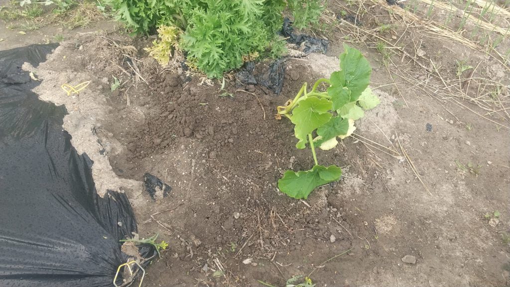 かぼちゃも隣の人から3株も貰った。葉が広がるので植えるところがなく、からし菜の一角と、豆との相性も悪くないと、ネットに載っていたので(ほんとかな、エンドウに影響ないかな)、スナックエンドウの端っこに2こ植えた。穴肥の入れた上なので、肥料食い過ぎて、弦ボケになるかもしれない。