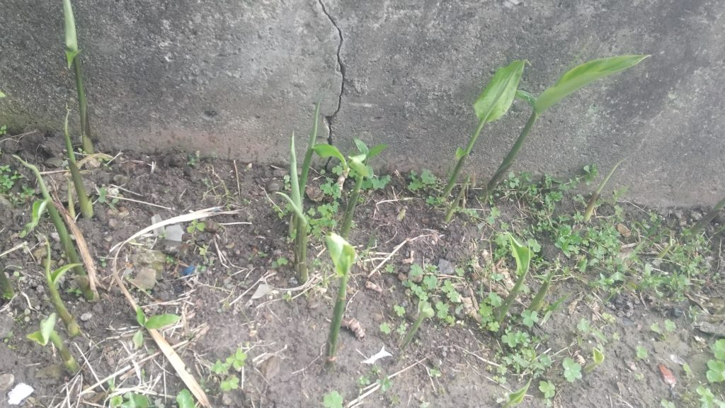 さといも10個と生姜3個を10センチ下に植えた。生姜は案外大きく割って、前に植えた時は小さすぎたと思う、芽が出なかった。今年は大きめに割った。