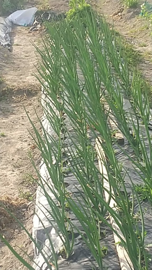 4月10日の玉ねぎの写真では、とてもきれいな成長ぶりで今年は期待していたのに、1ケ月少しでこんなに変わった。近くの菜園の玉ねぎもこんな感じだ。ベト病だろうか、わからないが菌がまん延しているとしか思えない。そんなに雨も降らなかったし輪作もしていないのだけれど、、、。球が大きくなるときに気温が下がるのが良くないのかなあ。渇いているように思って水をやったのがいけなかったかもしれない。とにかく菌なら避けようがない。玉ねぎは難しい。ほんとにまともに出来たことがないように思う。土壌消毒しなければ無理なのだろうか?