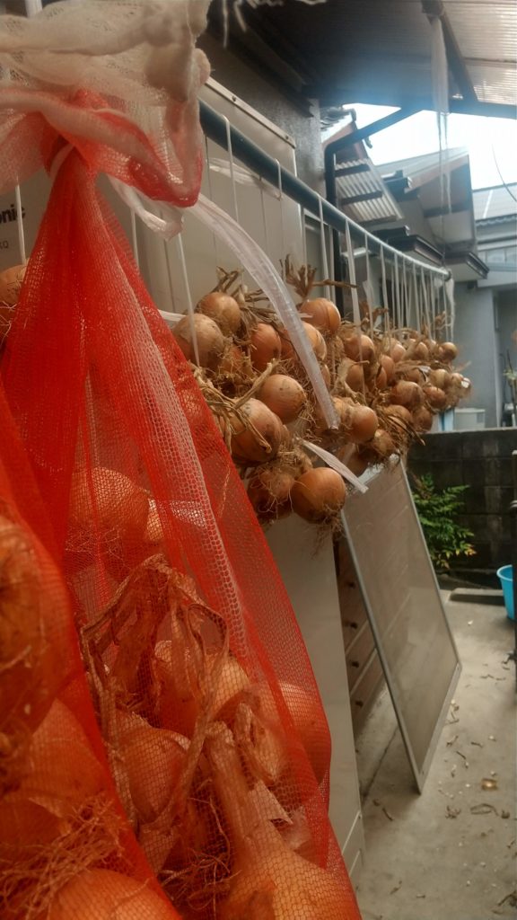 今年は穴あきマルチを使ったのと昨年より雨が少なかったのと、玉ねぎの葉が倒れてから収穫したので、昨年よりは腐らないかもと期待している。
