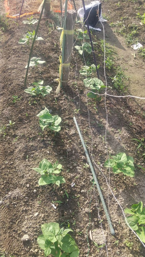 エンドウの後の支えを利用して、弦ありインゲンの種を植えたのが大きくなってきた。サンド豆というくらいなので、3度種がまけるという意味みたい。豆まきも6月に入ってからだったが、弦なしのインゲンも植えているので、それが終わった後くらいに、ちょうどよく収穫じきになると思う。ちょっとまき過ぎた。多すぎな気が、、