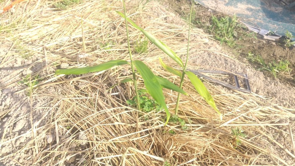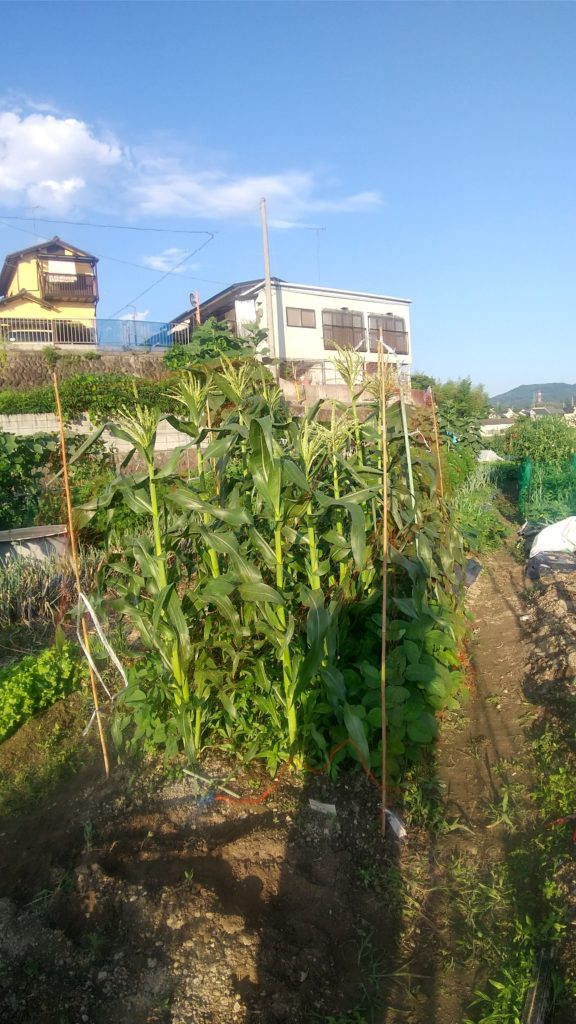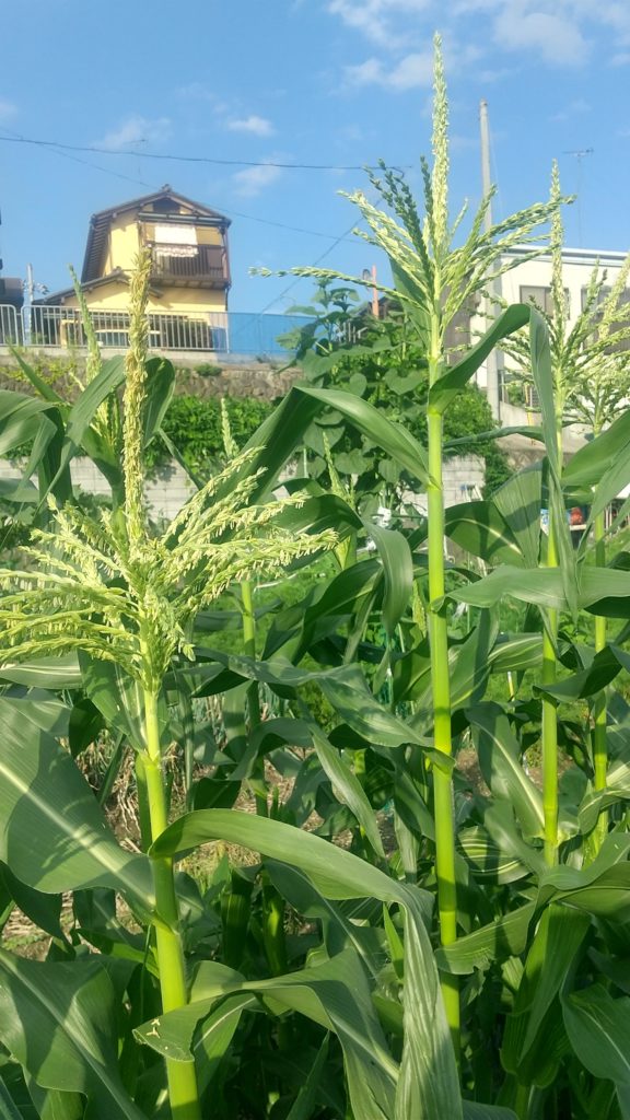 トウモロコシの穂が出ていて、その穂が下に落ちて実が出来る、もうすぐ実ができてくる。そうなると動物やカラスの大好物なので、採られないようにオレンジの網をかけた。ほんといろいろ、いろいろ、、、。