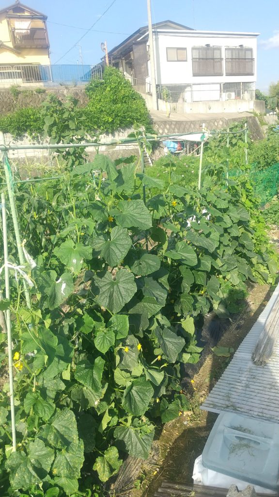 一雨ごとにきゅうりが大きくなってきた。一気に実ができそう。いっぱい小さなのができている。