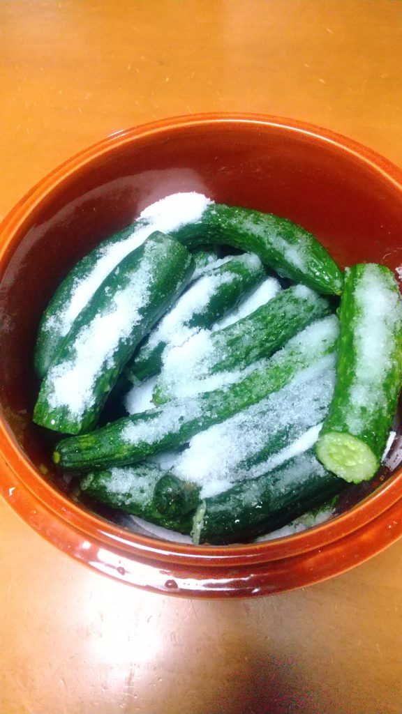キュウリは、いつもの通りのQちゃん漬け、又小分けにして冷凍庫へ入れた。冷凍庫もこれだけでいっぱいになりそう。それでも余るので、会社の同僚に聞いた塩漬けにしてみた。塩が適当でいいのか? つけてからネットでやり方を見て、塩水をいれて、重しをした。いい加減でうまくいくかわからない。
