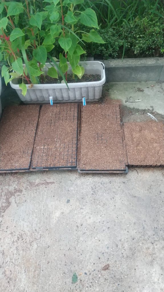 後はブロッコリー3本、カリフラワー3本の苗、手前は大根の種をまいた。全部で26本分、種の上に燻炭を載せた。