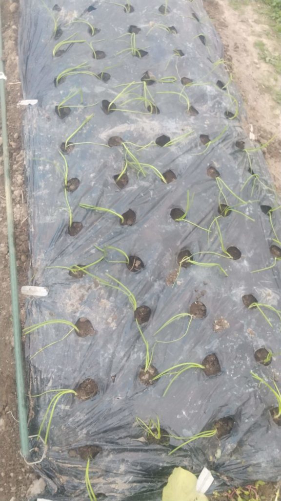 穴あきマルチに一本づつ、買った苗を植えた。あんがい細くて5mmくらいだったと思う。今なら7mmくらいのでも良かったが、大きな玉ねぎは、悪くなるのも早いので、小さいのでもいい。