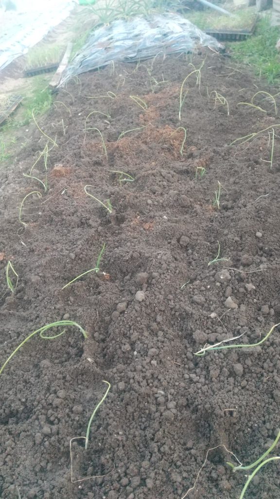残りの畝にせっかくの失敗の細ーい、トレイの苗も植えた、200本くらいになったか。この細さトレイから外すのも大変だった。