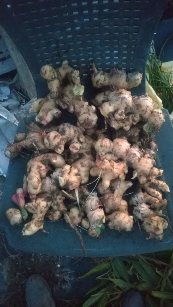 でっかい種イモの芽から次々と芋がつながり、一個ですごい数の生姜が採れた。これで2つだもの。