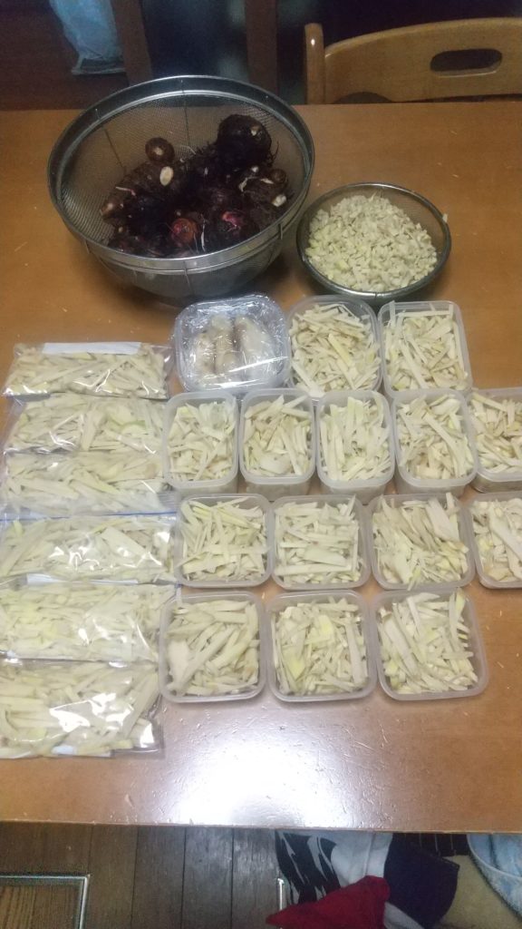 千切りがほとんどで、みじん切り少しと、おろし用に丸のままのを少し作って冷凍庫に入れた。