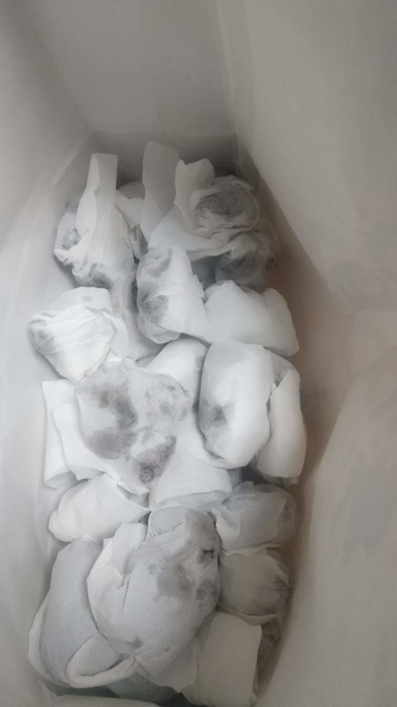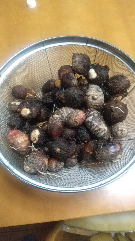 里芋は結局 成長が小さかったから収穫の量は少なかったし、粒も小さいのが多かった。でも小さくても採りたては軟らかくほかほかで大好きだ。豚汁なんかに入れると美味しいので、小さいのを少しづづ入れている。保存はネットで見た。キッチンペーパーに包んで紙袋に入れて保存する、昨年はそのまま箱に入れて、外に置いていたが霜に当たると、ふにゃふにゃになるのもあるので、今年はこの方法でやってみた。ただ、洗ってしまったが土をつけたままのほうが良いらしい。しょうがない、数も少ないので悪くならないうちに食べてしまおう。