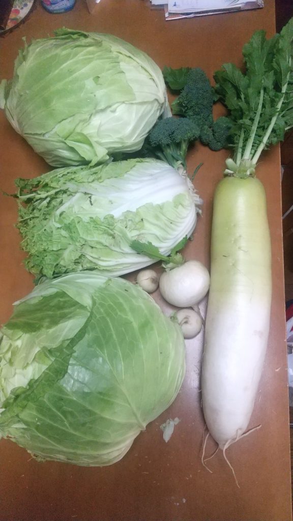12月10日に収穫、キャベツは30cmありそうなくらい大きくなっている。もう収穫しなければ割れてきそう。葉が軟らかくサラダでも炒めてもおいしい。冷蔵庫に入らないので芯を取ってキッチンペーパーを水に濡らして、新聞紙に撒いて納戸に入れた。先日、その前に収穫したキャベツもあったので、お好み焼きや、キャベツの方が多いくらいの焼そばを作った。こうすると家族もいっぱい食べる。