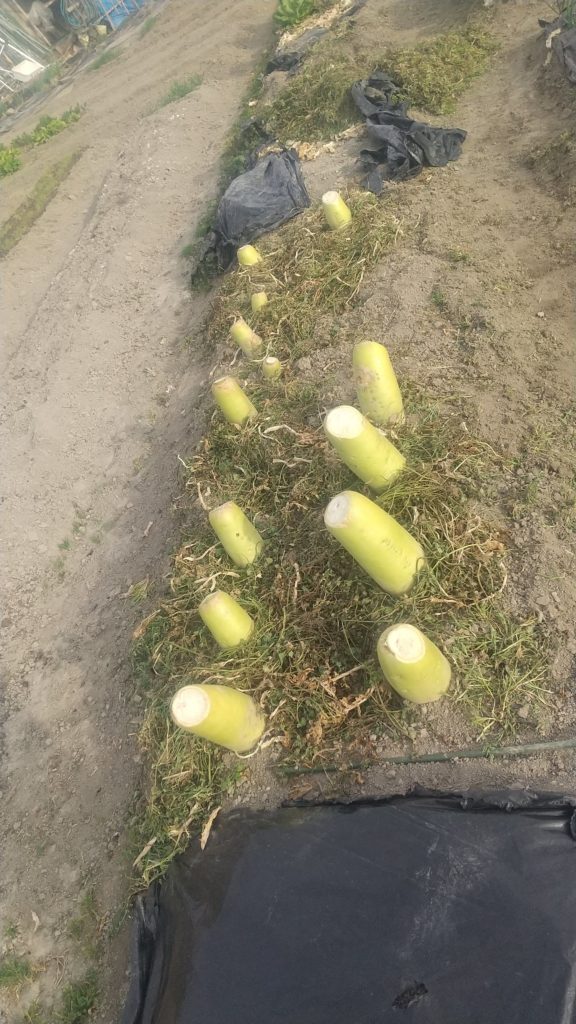 足のリハビリになると思い、畑の半分は隣の二人の人がトラクターで耕してくれたのできれいだったが、半分は草だらけだったので、椅子に座りながら草引きをした。残りはあと二筋、これだけで済んだのは、ほんとに隣の二人に感謝、感謝、感謝トラクタなどに入れるガソリンでお礼しようと思う。