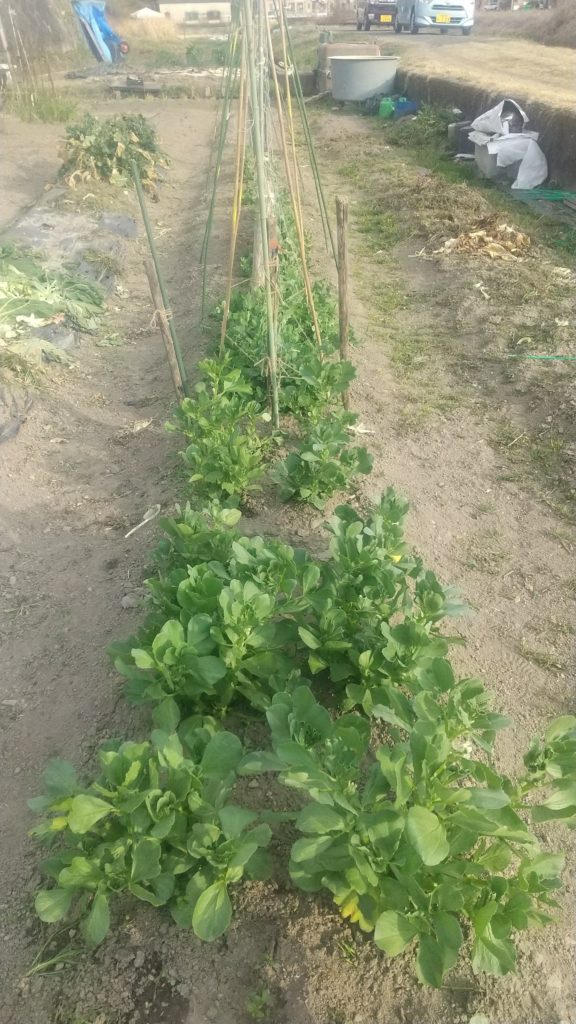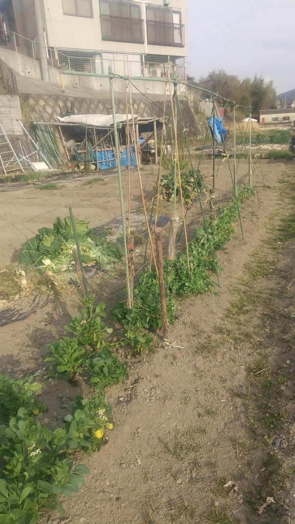 エンドウの支えをする、足がくねらないように気を付けながらやった。スナップの出来が悪そうだ。うまく芽が出なかったので、しょうがないけどそれでも、少しでも採れたらいい。大根は毎年の保存、油粕の肥料を入れたので、見事に大きい、それでもそろそろ収穫して干して甘酢につけようと思う。