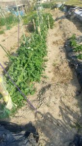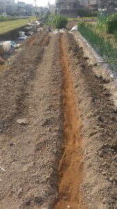 黒マルチ周りを土で抑える、準備完了