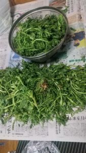 これから野菜の処理 ううう春菊の先だけちぎった。はああゆでてラップ、おわった!畑は夏野菜の準備で、冬…