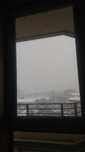 窓の外は、雪だった。景色はきれいだけど、もう雪は見たくない。歩いている人とか、大丈夫かと思ってしまう…