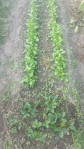 手前イチゴ 奥 カブほうれん草春菊ミニ白菜9月の中頃に種をまいた菜っ葉が芽を出して、少し雨もあり大き…